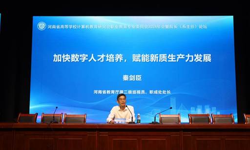 开幕式结束后,秦剑臣做了题为《加快数字人才培养,赋能新质生产力发展》的主旨报告。秦剑臣在报告中解读了中央和河南省委、省政府对职业教育改革的政策文件,强调指出,高等职业院校要培养更多的高素质技术技能人才,就要认认真真地落实职业教育中的“五金”建设,通过加速专业结构优化、加快数字化转型发展,加强教师队伍建设、赋能经济社会发展,深化学习互鉴,加强交流合作,开拓思路、改革创新,突破发展瓶颈,提升发展质量,为河南省计算机职业教育的改革发展和人才培养做出积极贡献。
