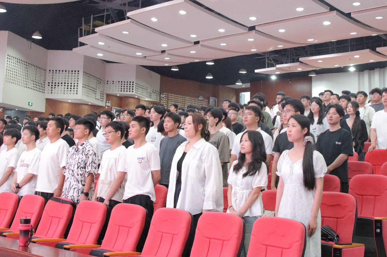 毕业典礼在庄严的国歌声中拉开帷幕,全场师生庄严肃立,高唱中华人民共和国国歌。