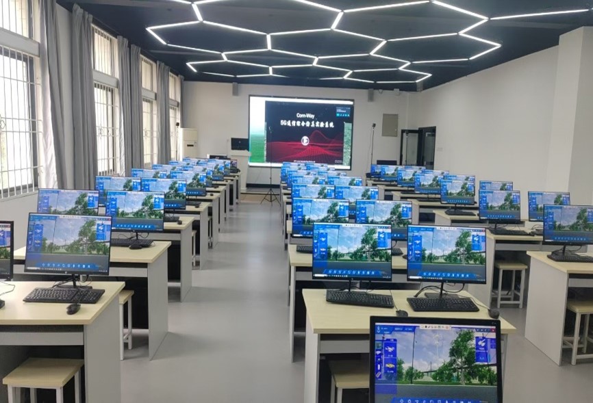 本实训室建筑面积80平方米,设60个标准实训工位,主要面向现代通信技术专业,是集教学、实训、社会培训与技术服务于一体的5G技术综合性实践平台。